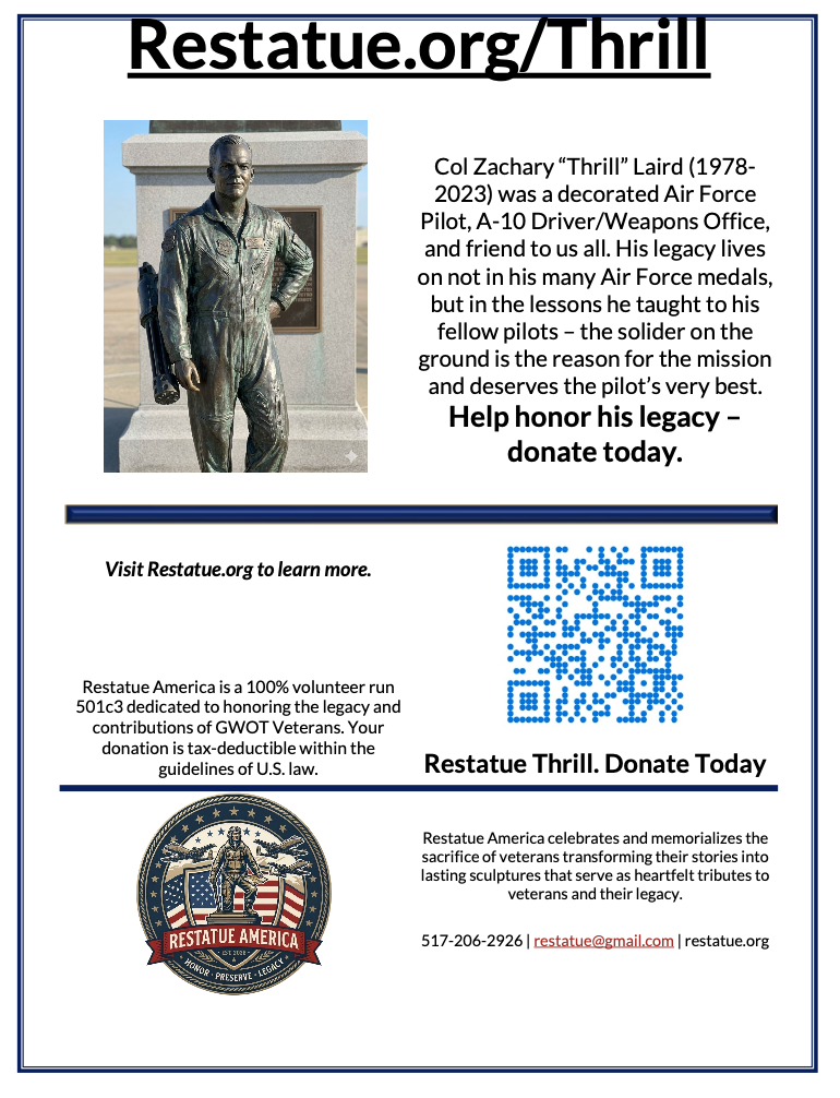 If you asked anyone who worked with him, they wouldn’t just talk about his medals or his flying. They’d talk about the kind of leader he was. Thrill was the definition of “servant leadership.” He was approachable, kind, and always made sure his team focused on what matters most – the solider on the ground. He built a culture of respect wherever he went, and the impact he had on our country—and the people he served with—is something that deserves to be honored and remembered through Restatue America.